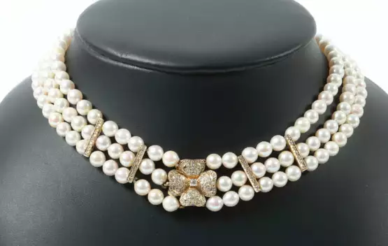 Lot 1429 | Perlencollier 20. Jhr., 3-reihig, mit Perlen im Verlauf, Verschluss in…