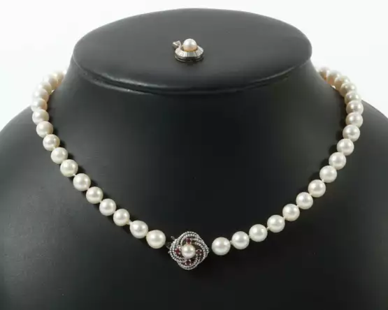 Perlenkette und Schließe 20. Jhr., Perlenkette im Verlauf, Schließen in Weißgold 585, punziert, Perlendurchmesser: 7 mm, L: 60,4 cm. Tragespuren.