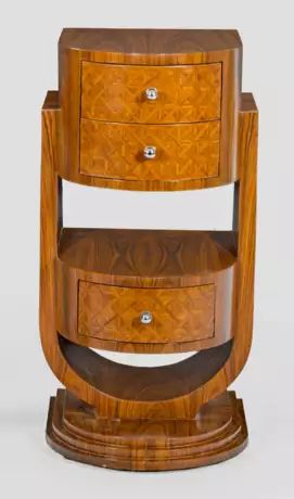 Nussbaum, furniert. Über gestuft ansteigendem Sockel breite Seitenwangen als Träger für bombierte Zargenkästen mit Schubfächern, schauseitig furniert mit Gitterwerk. H. 90 cm. 46 cm x 47,5 cm.
