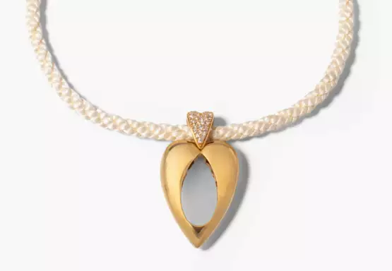 Italien 1996. 750 Gelbgold. Signiert und nummeriert. Stilisiertes Herz mit tropfenförmigem Durchbruch an einer pavégefasste Anhängeröse, zus. ca. 0.70 ct. L 5 cm, L Seidenkordel 93 cm, 18 g.