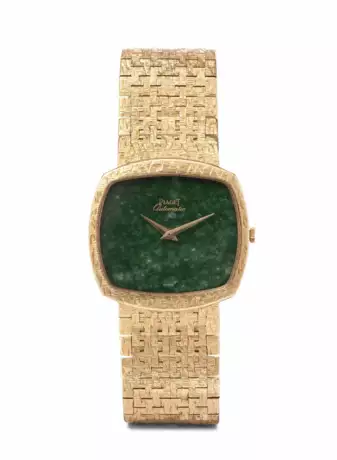 Ref. 12731. Kissenförmiges, strukturiertes 750 Gelbgold-Gehäuse, Nr. 215637, 32x31 mm. Nephrit-Zifferblatt mit goldenen Dauphine-Zeigern, signiert. Automatik Kal. 12P1, Werk Nr. 9114345, mit kleinem Rotor. Goldband strukturiert und leichtem Verlauf mit Leiterverschluss. Innenumfang ca. 16 cm. Gesamtgewicht 82 g. Funktionstüchtig. Mit zusätzlichem Bantteil von 1,8 cm, 6 g.