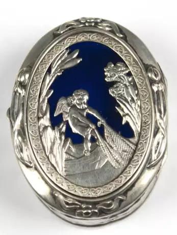 Lot 710 | Pillendose, oval, 800er Silber mit blauer Emaille, mit figürlichem und floralem Dekor, innen mit Widmung dat. 1914/15, Ges.-Gew. 31,9 g, 2,1x5x3,8 cm