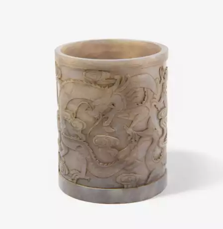 China, 1.Hälfte 20.Jh. Hellgraue Jade mit weissen Zonen. Zylindrisches Behältnis mit reliefiertem Drachendekor. H 15 cm.