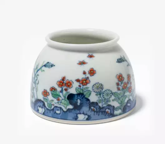 China, 20.Jh. Porzellan. Am Boden die apokryphe Sechszeichen-Kangxi-Marke. Rundes Gefäss mit Blumen- und Schmetterlingsdekor in den Doucai-Farben. H 6,5 cm.