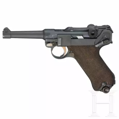 Kal. 9mmLuger, Nr. 8746, nummerngleich (inkl. Schlagbolzen und Griffschalen). Blanker Lauf, Länge 10 cm. Siebenschüssig. Kaiserlicher Beschuß. Vordergelenk gemarkt Krone/"Erfurt", auf der Hülsenbrücke "1920/1918". Zur Gänze leicht überarbeitet und phosphatiert, Zerlegehebel und Abzug gelb angelassen, sonstige Kleinteile brüniert bzw. blank (Ausstoßer, Sicherungsstange). Gut erhaltene Walnußgriffschalen mit feiner Fischhaut. Falzmagazin mit Bakelitboden, ohne Nummer.