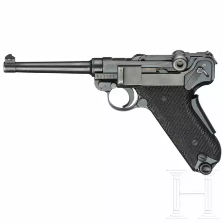 Kal. 7,65mmLuger, Nr. 64165, nicht nummerngleich (Lauf und Gabelgehäuse Nr. 75721). Spiegelblanker Lauf, Länge 100 mm. Originale Brünierung. Zeitgenössischer Schweizer Beschuss ("BP"). Schweizer Kreuz im Wappenschild am Kniegelenk, WFB-Firmenzeichen am Griffsporn. Griffsicherung. Griffschalen aus dunklem Kunststoff. Gefalztes Magazin mit schwarzem Kunststoffboden. Fast neue Erhaltung. Dazu Holster mit seitlich angebrachtem Magazinfach. Rückseitig zwei Gürtelschlaufen und Herstellerstempel ,,J. ZOSSO / 45 / ATTALENS". Leder etwas speckig, Nähte in Ordnung.