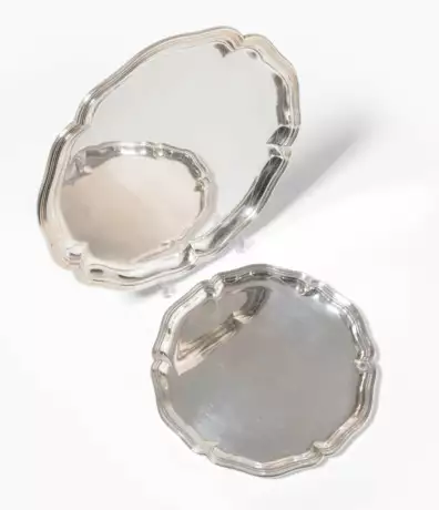 Silber, Meistermarke undeutlich. Rundform mit fassoniertem und profiliertem Rand. Berner Beschau-, Beizeichen, D 30 cm, ca. 690 g.