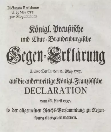 ╔Dabei:╗ Anderweites Kayserlich allergnädigstes Commissions-Decret, an Eine Hochlöblich-allgemeine Reichs-Versammlung zu Regenspurg, de dato 9. Junii 1757, den gewaltsamen Chur-Brandenburgischen Einfall in die Chur-Sächsischen und Chur-Böhmischen Lande betreffend. Nebst Beylagen No. 1 bis 4. Regensburg, o.Dr. 1757. Kl.4°. 14 S., 1 w. Bl. Ohne Einband, ausgebunden. - VD 18, 90243218. - Tls. leicht stockfleckig. - ╔Umständlichere Beschreibung╗ des am 18ten des Monats Junii bey Chotzemitz in Böhmen vorgefallenen sehr blutigen Treffens. Wien, o.Dr. 1757. Kl.4°. 4 Bl. Ohne Einband, ausgebunden. - VD 18, 10181822-003. - Etw. wasserrandig. - ╔(Ponickau,J.G.v.)╗ Schreiben Des Königl. Pohlnischen und Chur-Sächsischen Herrn Comitial-Gesandtens an die allgemeine Reichs-Versammlung, d. d. Regenspurg den 10ten Jun. 1757, denen von der Chur-Brandenburgischen Comitial-Gesandtschaft exhibirten Vorstellungen de dictatis 10. und 26sten May entgegen gesetzt. Regensburg, o.Dr. 1757. Kl.4°. 4 Bl. Ohne Einband, ausgebunden. - VD 18, 1037924 X.
