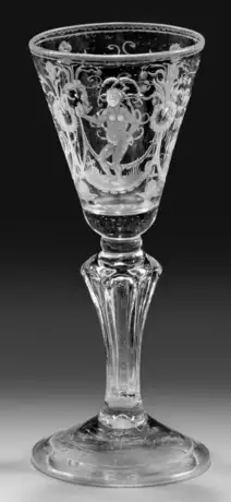 Farbloses Glas mit geschnittenem Dekor. Auf dem Fuß mit umgeschlagenem Rand pseudofacettierter Schaft. Am Übergang zur Kuppa gedrückter Ringnodus. Auf der konischen Kuppa eine nackte Figur mit brennendem Herzen in der Hand sowie die Inschrift "Brennen und still schweigen". Weiter zwei Spiegelmonogramme, umrahmt von Festons mit Blumenbekrönung. H. 15,8 cm.