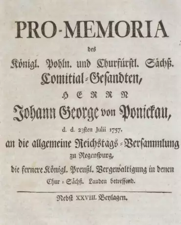 ╔Dabei:╗ Plotho,E.C.v. Pro-Memoria des Königl. Preuß. und Chur-Brandenburgischen Comitial-Gesandten, Herrn Ehrich Christoph Freyhrn. von Plotho, d.d. 30sten Julii 1757, an die allgemeine Reichstags-Versammlung zu Regenspurg, in Antwort auf das Kayserl. Commißions-Decret vom 9ten Julii h. a. die Angelegenheiten der Königin von Pohlen Majestät betreffend. O.O.u.Dr. 1757. Kl.4°. 4 Bl. Ohne Einband, ausgebunden. - VD 18, 10600965-006. - Tls. leicht stockfleckig. - ╔(Friedrich II., König von Preußen).╗ Anzeige, einer von einigen zu dem Dresdenschen Hofe gehörigen Personen, zum Nachtheil Sr. Königl. Majestät in Preussen, mit Deroselben Feinden gepflogenen Correspondentz. Mit Beylagen. Bln., Henning 1757. Kl.4°. 8 S. Ohne Einband, ausgebunden. - VD 18, 10309462. Nach KVK eine von mehreren Druckvarianten (hier mit Zierbuchstabe D auf S. 2). - ╔Plotho,E.C.v.╗ Pro-Memoria des Königl. Preuß. und Chur-Brandenburgischen Comitial-Gesandten, Herrn Ehrich Christoph Freyhrn. von Plotho, d. d. 4ten August 1757, an die allgemeine Reichstags-Versammlung zu Regenspurg, in Antwort auf Zwey Kayserl. Commißions-Decreta vom 11ten Junii und 11ten Julii h. a. den Herrn Obristen von Meyer und die Stadt Erfurth betreffend. O.O.u.Dr. 1757. Kl.4°. 4 Bl. Ohne Einband, ausgebunden. - VD 18, 10600965-011. - Leicht stockfleckig.