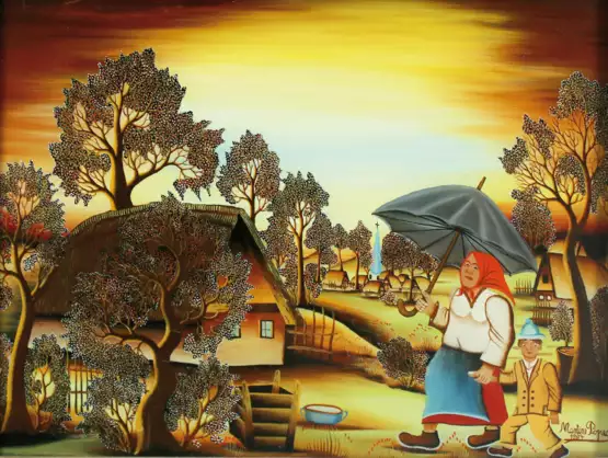 (wohl Kroatien, 20. Jh.). Bäuerin mit Regenschirm u. kleinen Jungen an der Hand vor einem Bauernhaus. Naive Hinterglasmalerei 1984. 28 x 38,, Rahmengr. 38 x 48 cm. Unt. re. sign. u. dat.