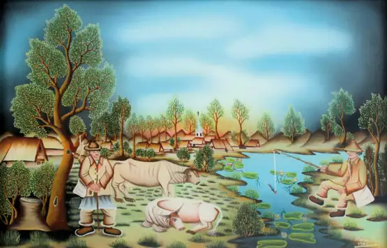 (wohl Kroatien, 20. Jh.). Kuhhirte mit seinen Tieren am Seerosenteich u. Angler. Naive Hinterglasmalerei 1986. 29 x 45, Rahmengr. 40 x 56 cm. Unt. re. sign. u. dat.