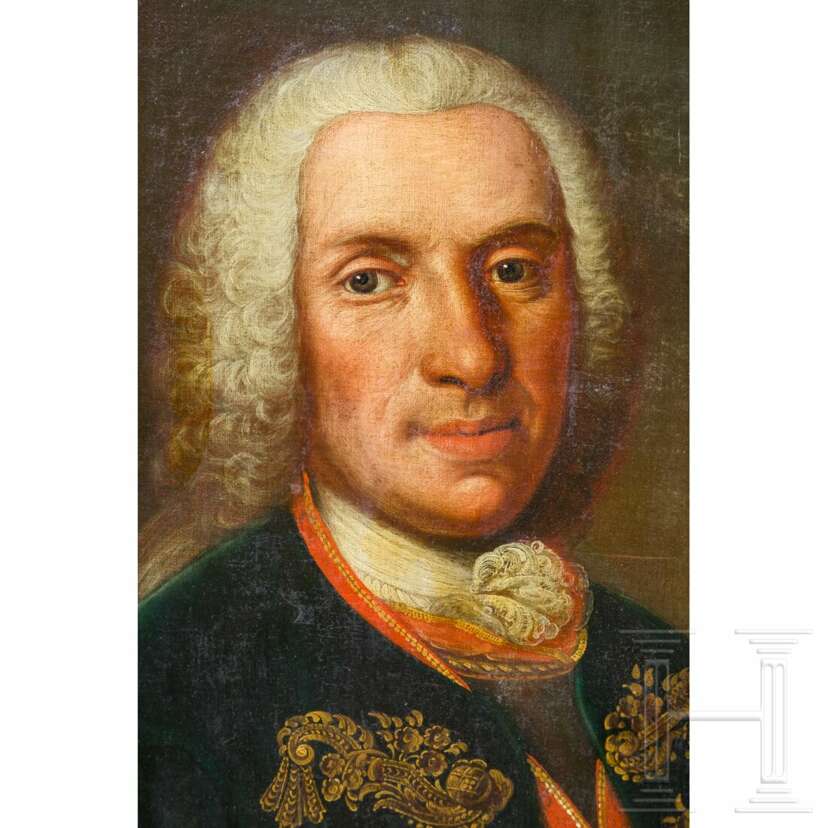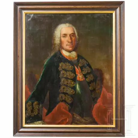 Öl auf fein gewebter, dichter Leinwand mit rotbrauner Grundierung, unsigniert. Halbfigur eines Adligen mit Allongeperücke, Kürass, dunklem Galarock mit kunstvollem goldenen Besatz, pelzverbrämtem roten Umhang und angelegtem Ordensschmuck in Form der Halsdekoration des Ordens vom Weißen Falken am roten Band mit goldenen Kanten. In neuem hölzernen Profilrahmen. Rs. am alten Holzrahmen der Leinwand kleine neuzeitiche Verstärkungen, Malfläche vereinzelt berieben, Gebrauchs- und Altersspuren. Bildmaße 82 x 65 cm, Rahmenmaße 97 x 80 cm. Sehr repräsentativ und schön erhalten.