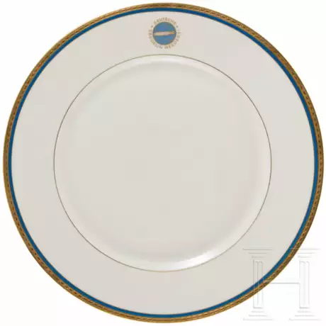 Weiß glasierter Porzellanteller mit blauer und goldener Umrandung, im oberen Bereich das Wappen der Deutschen Zeppelin-Reederei, auf der Rückseite die Herstellermarke "Heinrich & Co. Selb" sowie der Schriftzug "Heinrich-Elfenbein-Porzellan - Eigentum der Deutschen Zeppelin-Reederei". Sehr schöner Zustand, Durchmesser 25,5 cm.