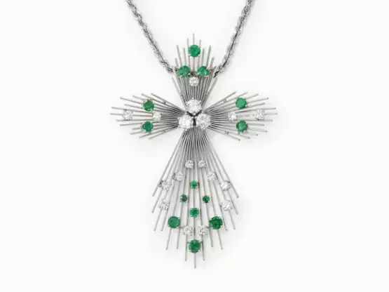 White gold 585/-, hallmarked and assayed. 18 brilliant-cut diamonds totalling approx. 3.12 ct., fine white, G, VVS1, calculated weight. 14 round faceted, rich green emeralds with jardin totalling approx. 3.05 ct., calculated weight. In good to very good condition. Necklace length approx. 53.5 cm, cross approx. 8.3 x 6 cm. Ca. 42.07 g.