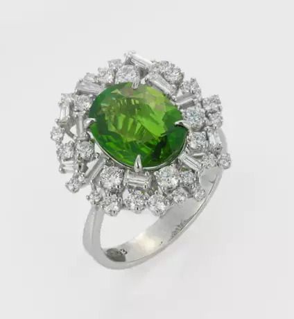 Ring set with a vivid green tsavorite (no treatment) approx. 3,32 ct. and diamonds approx. 0,93 ct. (H/si), in 18 k white gold. Certificate included.