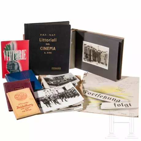 Ca. 120 teils großformatige Fotos, lose bzw. in einem Album, vom Besuch einer italienischen Delegation in Deutschland (u.a. München) bzw. vom Besuch einer deutschen Delegation in Italien, darunter viele Aufnahmen mit Führern der Partei, SA und SS sowie der entsprechenden italienischen Organisationen. Dazu teils stärker beschädigte deutsche und italienische Bücher bzw. Einbände und Schriftverkehr/Dokumente.