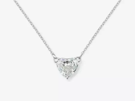 White gold 750/-, hallmarked. 1 heart-shaped diamond, approx. 1.80 ct., fine white - white, G - H, VS2. In mint condition, unworn, handwork. Length approx. 43 cm, heart approx. 8.7 mm x 1.1 cm. Ca. 2.67 g.