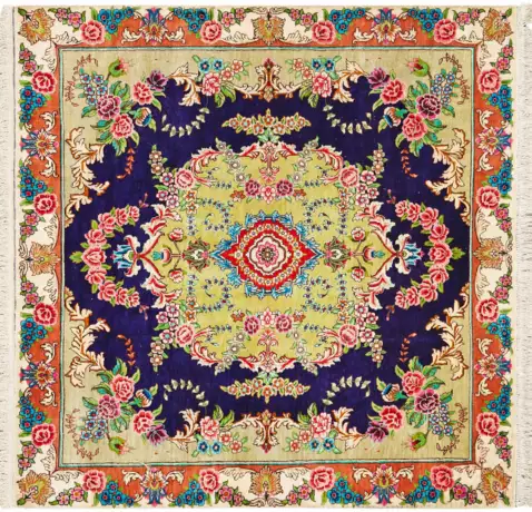 Persien. Seide auf Seide. Auf tintenblauem Fond große, gelb-grüne Reserve mit Zentralmedaillon. Korrespondierende Ecklösungen. Musterung aus üppigen Blütenzweigen. Umlaufend breite, korrespondierende Bordüre. 103 cm x 100 cm.