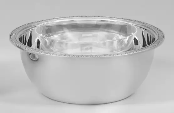 Sterlingsilber und Glas. Konische Schale mit glatter Wandung, umzogen von ausgestellem, reliefierten Rand mit Lanzettblattdekor. Runder Einsatz auf drei leicht ausgestellten Füßen, darin konische Glasschale. Modell-Nr. 9678. Gest. 925, Herstellerzeichen, Händlermarke "Gebrüder Weyersberg Düsseldorf". Gew. ohne Glas ca. 585 g. D. 18,5 cm.
