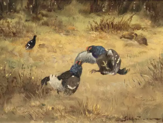 Lot 80 | "Balzende Birkhähne", Öl/ Lw., undeutl. sign. u.r., 24,5x30 cm, Rahmen