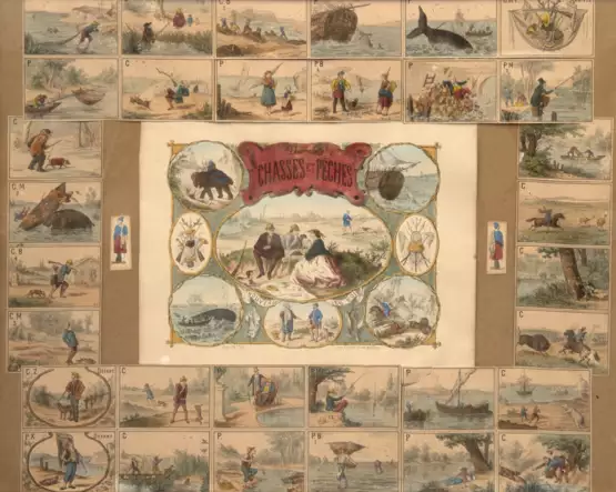 Lot 260 | "Chasses et Peches", verschiedene Grafiken mit Szenen vom Jagen und Fischen, Blätter gebräunt, teilweise kl. Farbverluste und Beschädigungen, Gesamtmaß 49x59 cm, hinter Glas und Rahmen