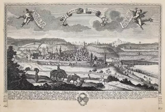 Ravenspurg. Ansicht der Stadt mit Kutsche und Personenstaffage im Vordergrund. Kupferstich von Johann Christian Leopold, 18. Jh. Blgr. 23 x 34 cm. - Re. zwei Rep. - Selten.