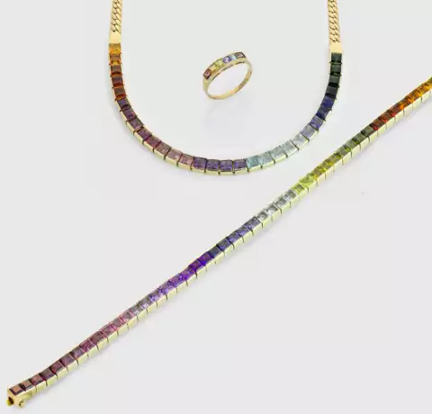Collier mit korrespondierendem Armband und Ring. Gelbgold, gest. 585. Linear besetzt mit Turmalin-Carrées von zus. ca. 43 ct. in sog. Regenbogen-Skala. Collier-L. ca. 43 cm, Armband-L. ca. 20 cm. Ges.-Gew. ca. 83,08 g.