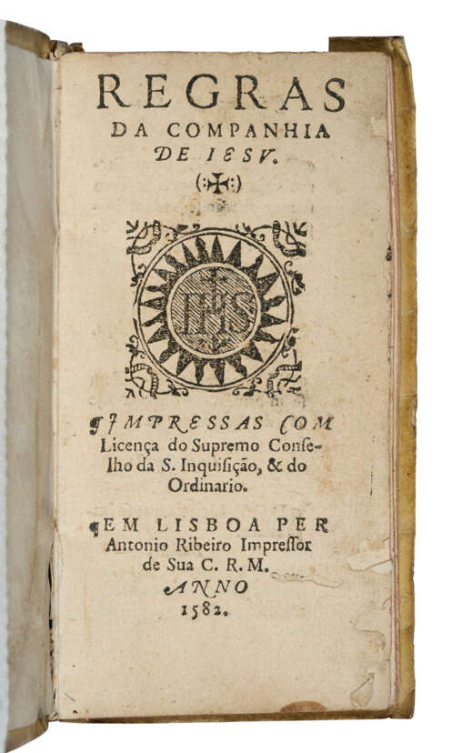 Rare Jesuit manual tailored for the Age of Discovery, in a contemporary binding. This edition of the rules of the Society of Jesus contains references to the Americas and other regions of Portgual's expanding empire, reflecting the changing focus of the order as many Portuguese Jesuits embarked on missions across the world. The stated missionary purpose for the Jesuits, for example, takes on a global perspective: “Nessa vocação he pera correr, & fazer vida em qualquer parte do mundo, onde se espera maior serviço de Deus, & ajuda das almas” [“Our vocation is to go forth and live in any part of the world where greater service to God and help for souls is expected]. One section details how to pray for the conversion of the Americas, both the Indies and more northern regions: “Cada sacerdote diga cada mês duas missas: uma pelas Índias e conversão dos Gentios; e outra pelas partes setentrionais e redução dos hereges.” Similarly, there is a call to pray for provinces’ founders: “Cada sacerdote diga três missas pelo fundador vivo da província e benfeitores.” Anselmo 954.