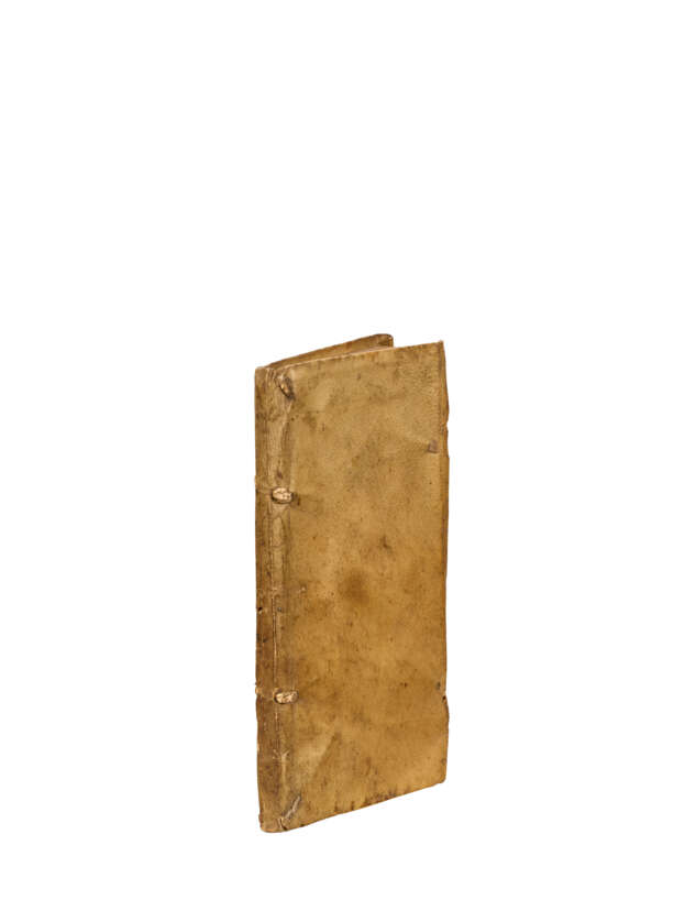 12mo (132 × 70mm). Woodcut Jesuit device on title-page, woodcut initials and tailpieces (worming, light stains). Contemporary ?Portuguese limp vellum, yapp edges, edges stained (worming, stains, edges faded). Provenance: José Mindlin, 1914–2010 (bookplate).