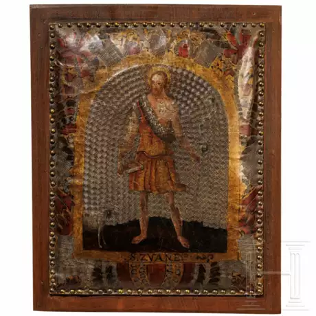 An eine kräftige Eichentafel genagelter Polsterbezug aus starkem Leder. Im Bildfeld Darstellung des Johannes des Täufers(?) mit Schriftrolle, Buch und dem Agnus Dei zu seinen Füßen. Bezeichnet "S. Zvane:b" (wahrscheinlich für St. Iohann/Ivan/Zvan/Zvane). Umrahmt von prachtvoll in verschiedenen Mustern geprägten Ornamenten und Blumendekor. Berieben, am Rand vereinzelt Risse.Maße: 49,5 x 39 cm, Gesamtmaß: 56,5 x 45,5 cm.
