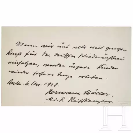 Karte auf beigefarbenem Briefkarton (ca. 14,5 x 9 cm), "Wenn wir uns alle mit ganzer Kraft für den deutschen Wiederaufbau einsetzen, werden unsere Kinder wieder bessere Tage erleben." Datiert und eigenhändig signiert "Berlin. 6. No. 1928. Hermann Müller M. d. R. Reichskanzler".