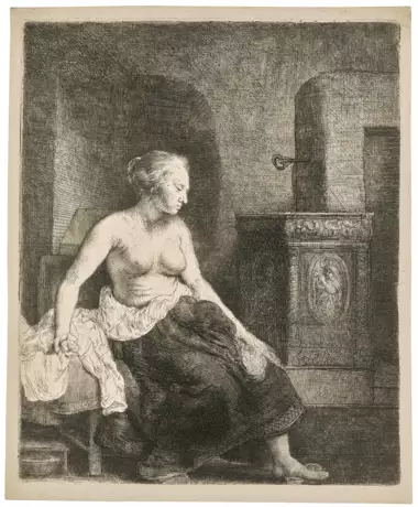 Woman sitting half dressed beside a Stove