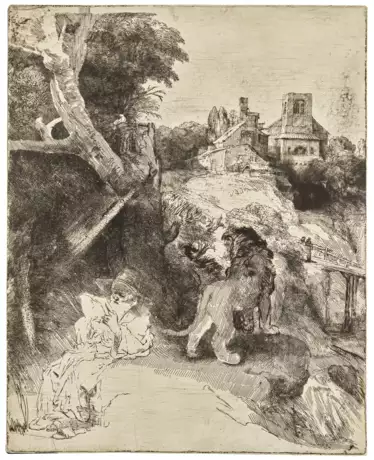 printing with rich burr on the lion's mane, tree stump, shrubs, figures on the bridge and elsewhere