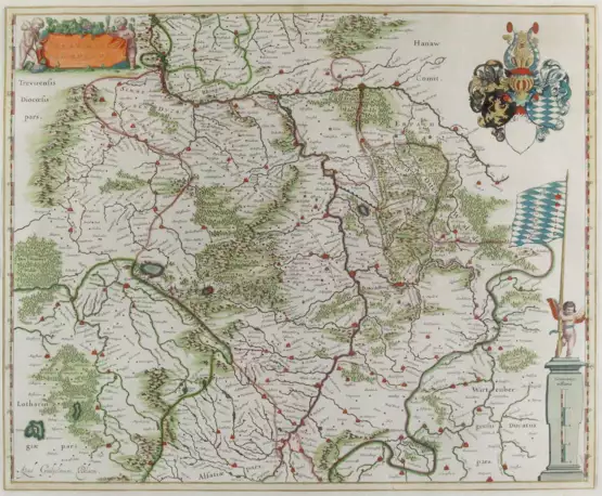 Karte mit Fürstenkolorit. - ╔Dabei:╗ Exactissima Tabula qua non solum ╔Regiones Palatinatus ad Rhenum.╗ Altkolor. Kupferstichkarte bei N.Visscher, um 1700. 45,5 x 57,5 cm. Mit gr. ausgem., fig. Titelkart. u. kolor. Meilenzeiger. Unter Passep. u. Glas gerahmt (nicht ausgerahmt). - Etw. gebr., stellenw. leimschattig, Falzeinriss unten. Zus. 2 Karten.