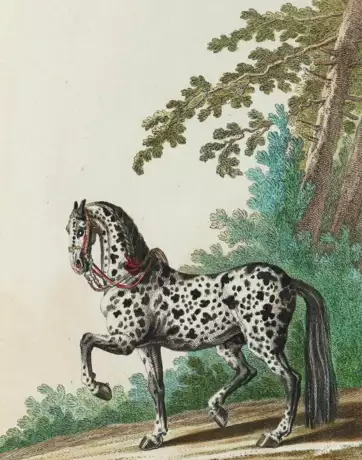 Thienemann, 919 ff. - "Herr Joh. Elias Ridinger, der sich durch seine vielen, unvergleichlichen Thierstücke unvergesslich gemacht hat, hat noch vor seinem Tode, welcher zu Augsburg den 11. April 1767 zum Nachtheile der Kunst und der Naturgeschichte erfolgte, ein Werk vollendet, welches seine Söhne im Jahre 1770 herausgegeben haben." (Beckmann, Johann, Physikalisch-ökonomische Bibliothek ... Bd. 3. Göttingen 1772, S. 154). Dieses ausgesprochen seltene Werk Johann Elias Ridingers war selbst dem Autor des Verzeichnisses seiner Druckgraphiken, Georg A. W. Thienemann, nicht vollständig bekannt. Thienemann konnte 44 Darstellungen mit ihren Titeln aufführen. Es handelt sich bei dieser Folge um den eigentlichen Höhepunkt der Pferdedarstellungen Ridingers. Wenngleich von kleinem Format, ist sie die einzige seiner Serien, die er am Ende seines Lebens vorhatte, koloriert erscheinen zu lassen. Die vorliegende Ausgabe ist die Erstausgabe, in ihr enthalten auch fünf von sieben jener Tafeln, die Thienemann aus eigener Anschauung unbekannt waren. Da die Zuordnung bei Thienemann nicht mit der vorliegenden Reihenfolge der Bindung übereinstimmt, werden die 50 kolorierten Radierungen in der Folge in der Reihenfolge ihrer Bindung aufgeführt, in Klammern die jeweilige Nummer im Verzeichnis Thienemanns. - Titelblatt (919). - "Die Benennung der äußeren Theile des Pferdes" (im einleitenden Text erwähnt). - "Die guthe Gestalt eines Pferdes" (im einleitenden Text erwähnt). - "Ein Pferd von allen Mängelen" (im einleitenden Text erwähnt). - "Von den Eigenschafften guther und böser Pferde" (948). - "Liecht oder Rehe Braun" (941). - "Gold Braun" (942). - "Kirsch Braun" (945). - "Castanien Braun" (943). - "Weichsel Braun" (946). - "Schwarz Braun" (947). - "Spiegel Braun" (944). - "Kohl Rappe" (952). - "Schwarz Brauner Rappe" (950). - "Roth Rappe" (951. Bei Thienemann als "Koth Rappe" aufgeführt). - "Maus Rappe" (nicht bei Thienemann). - "Gantz weisser Schimmel" (920). - "Apfel oder Spiegel Schimmel" (923). - "Liechter spiegel Schimmel mit weissen extremiteten" (nicht bei Thienemann). - "Schwartz Schimmel" (nicht bei Thienemann). - "Dunckler grau Schimmel mit weissen extremit:" (nicht bei Thienemann). - "Sand Schimmel" (921). - "Hecht Schimmel" (924). - "Eisen Schimmel" (922). - "Mohren Kopf" (949). - "Liechter roth Schimmel" (925). - "Roth Schimmel mit weisen Flecken" (926). - "Roth Schimmel dunkel gestiefelt" (927). - "Ordinair oder Liecht Fuchs" (935). - "Zobel Fuchs" (940). - "Gold Fuchs" (939). - "Kohl Fuchs" (938). - "Brand Fuchs" (936). - "Schweis Fuchs" (937). - "Dunkel geapfelter Falch" (933). - "Maus Falch" (932). - "Dunkel Falch" (934). - "Gold Falch" (930). - "Semmel oder Stroh Falch" (929). - "Isabell" (928). - "Silber Falch mit dunklen Haren" (931). - "Schwartz Schecke" (958). - "Hellbrauner Schecke" (954). - "Castanien brauner Schecke" (956). - "Schwartzbrauner Schecke" (957). - "Falcken Schecke" (953). - "Fuchs Schecke" (955). - "Tiger mit schwartzen Flecken" (961). - "Tiger mit braunen Flecken" (960). - "Tiger mit rothen Flecken" (959). - "Fliegen oder Mucken Schimmel" (nicht bei Thienemann). - Tls. stärk. fleckig, 6 Tafeln mit alten Reparaturen, einige Randläs.