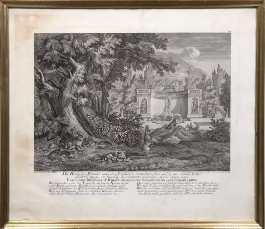 Lot 262 | Ridinger, Johann Elias (1698 Ulm- 1767 Augsburg) "Parklandschaft mit Hasen", Kupferstich, Blatt an den Rändern fleckig und wellig, am oberen Rand eingerissen, 34,5x42,5 cm, hinter Glas und Rahmen