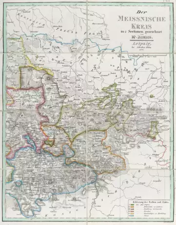 Nicht bei Engelmann, selten. - Enthält: Übersichtskarte (ganz Sachsen), Oberlausitz, Voigtländischer Kreis, Erzgebirgischer Kreis, Leipziger Kreis, Meissnischer Kreis (in 2 Sectionen). - Tls. leicht fleckig u. in den w. Rändern etw. wurmspurig.