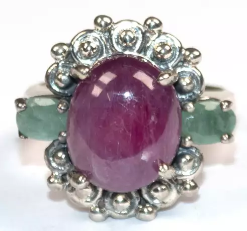 Lot 793 | Ring, 925er Silber, großer Rubin-Cabochon flankiert von 2 Smaragden, Steine mit natürlichen Einschlüssen und Oberflächenstruktur, RG 54, Innendurchmesser 17,2 mm