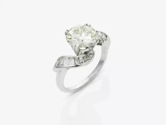 Platinum, hallmarked. Marks. 1 brilliant-cut diamond of approx. 3 ct., CA (M-N), VVS, 2 small octagonal diamonds totalling approx. 0.02 ct., approx. 15 baguette-cut diamonds totalling approx. 0.5 ct. The ring is in very good condition, showing only minor signs of wear and tear consistent with its age. Ringsize: 53. Ca. 7.8 g.