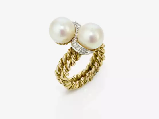 Yellow gold 585/-, (14K) hallmarked. 8 small brilliant-cut diamonds. 2 round, light cream-coloured cultured pearls. The ring is in very good condition, showing only minor signs of wear and tear consistent with age. Ringsize: 52. Ca. 10.5 g.