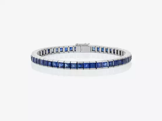 White gold 750/-, hallmarked. Jeweller's mark B. Approx. 52 treated carré-cut sapphires totalling approx. 8 ct. 1 sapphire broken. Length approx. 18.5 cm. Ca. 25 g.