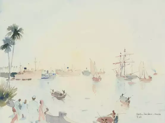 Cochim-Harbour-Kerala. 1961. Aquarell und Bleistift auf Papier. Unten rechts betitelt, monogrammiert und datiert. Blattgrösse 25,3x33,2 cm. Ohne Rahmen.