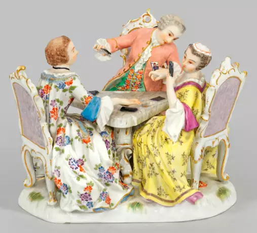 Auf unregelmäßigem, naturalistisch staffiertem und mit Blüten und Blättern belegtem Sockel komponierte, gesellige Spielergruppe. Um einen dreiseitigen, marmorierten Tisch mit plastisch aufgelegten Karten zwei sitzende Damen und ein Herr, beim Kartenspiel um Goldmünzen spielend. Polychrome Malerei mit Goldstaffage. Entw. Johann Joachim Kaendler. Modell-Nr. 1291. Minim. rest.; Schwertermarke. H. 14 cm. 17,5 cm x 16,5 cm.