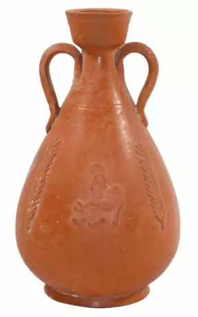 Mit Palmen- u. mythologischem Dekor. Nordafrika 3.-4. Jh. Terra Sigillata mit Doppelhenkel. 4 Palmwedel sowie figürlichem Dekor. H: 20 cm. Versand nur innerhalb Deutschlands.