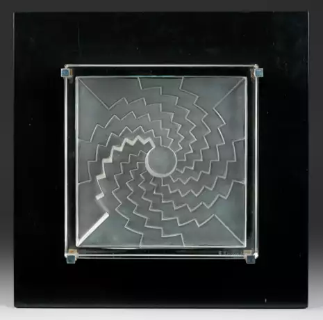 Farbloses, mattiertes Glas auf schwarz lackierter Holzplatte. Relief aus quadratischem Glasblock, eine Zickzack-Komposition, eine sich nach unten wendelnde Treppe darstellend. Künstler-Sign.; Manufakturmarke. Nummerierung 500/72. Maße Glasobjekt: 23,2 cm x 23,2 cm. Ges.-Maße: 37 cm x 37 cm.