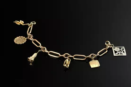 585 red gold charm bracelet with 6 pendants in 333, 585, 750 yellow gold and nickel, 27.5g, L. 19cm, clasp not precious metal, band worn out