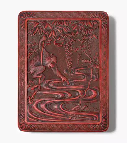 China, späte Qing-Dynastie. Rotlack. Auf dem Deckel im Relief ein Affe auf einem Baum, der auf eine schwimmende Schildkröte zeigt. Auf den Seiten ein Ornament- und Blattdekor. 25,5x19x5 cm.
