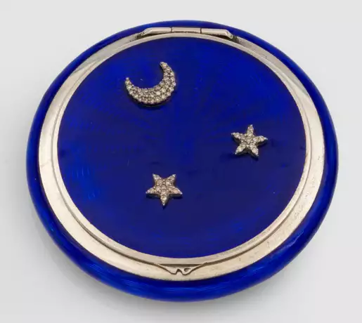 im Stil von Karl Fabergé. Silber, teilw. emailliert. Runder Korpus. Korpus tief royalblau emailliert. Auf dem Deckel zwei applizierte Sterne sowie eine zarte Mondsichel, ausgefasst mit Diamantrosen. Mit Etui. Gew. ca. 45 g. H. 1 cm. D. 5,7 cm.