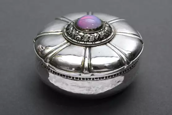 Lot 819 | Round hammered tin with opal glass cabochon on mul…